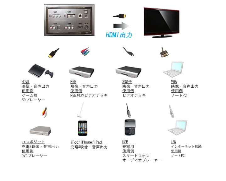 iPod/iPhone・HDMI・コンポジット・VGA・コンポーネット・S端子の入力をHDMIまでモニタに出力します。