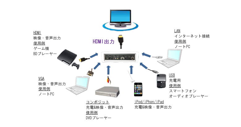 iPod/iPhone・HDMI・コンポジット・VGA・コンポーネット・VGAの入力をHDMIでモニタに出力します。