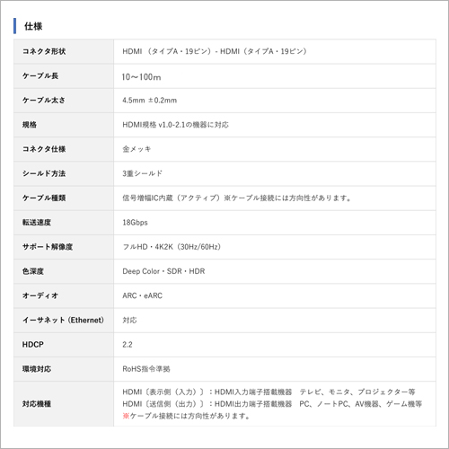 HDMI規格:v2.0(v1.0~V2.1の機器に対応) ケーブル径:4.5mm±0.2mm